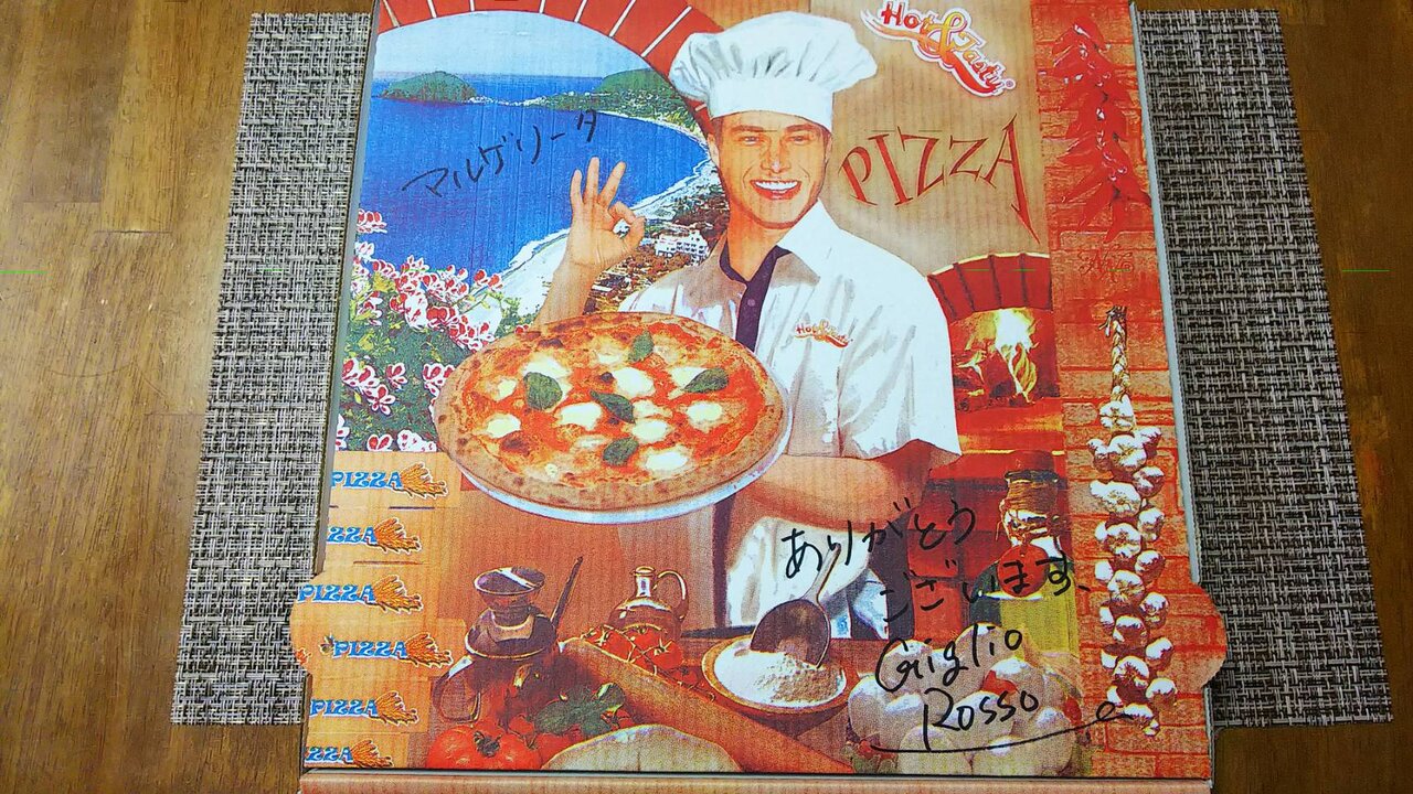 お持ち帰りいたしましたのはこちら。オシャレなピザの箱!右端にはメッセージが。