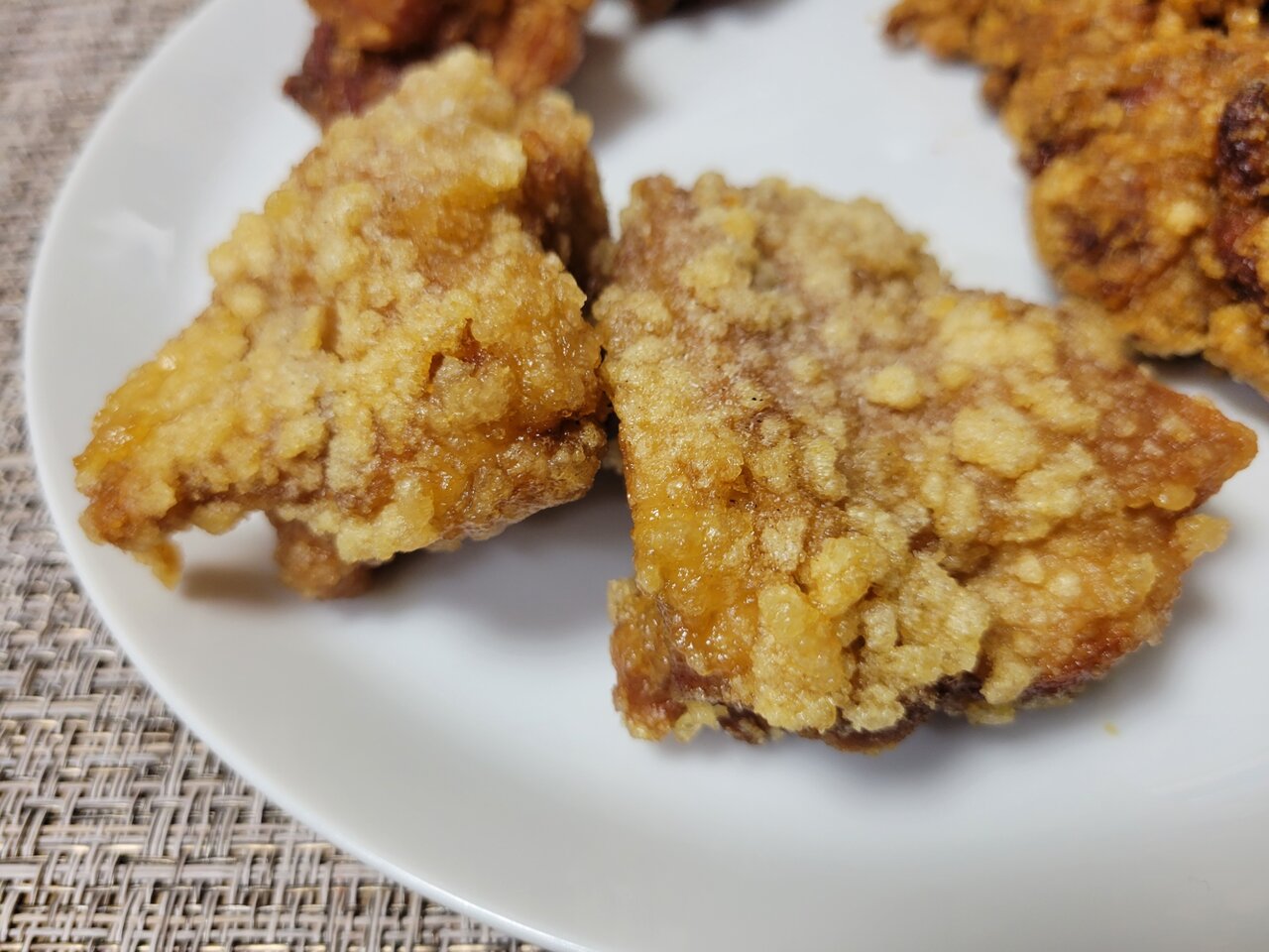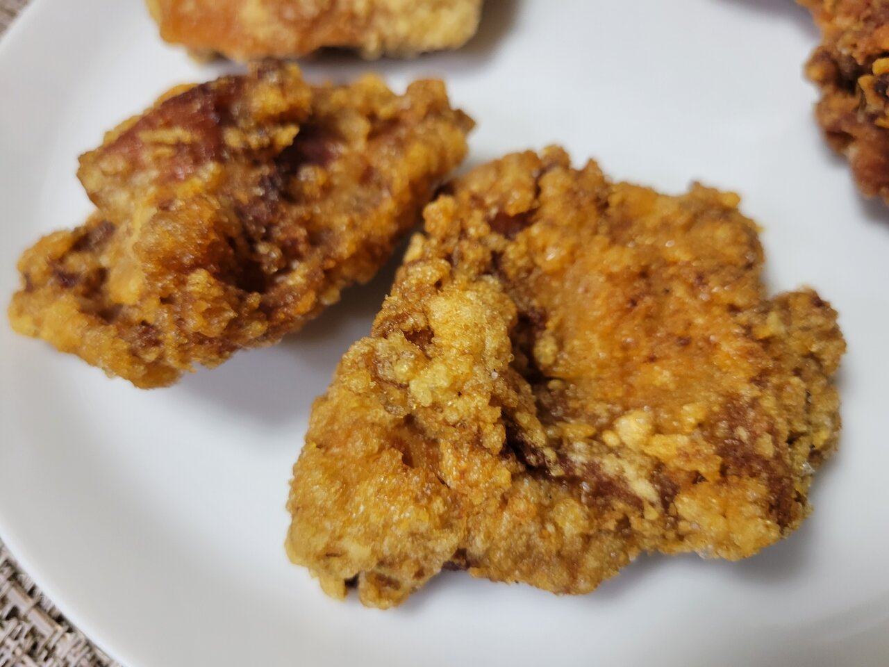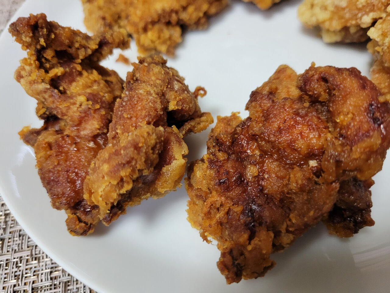 3つのから揚げを2つの袋にわけてお持ち帰りしました。お皿に盛ってみますとこんな感じ。