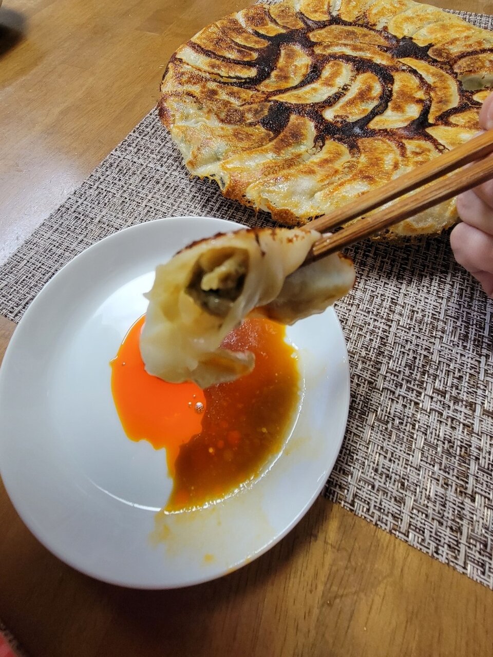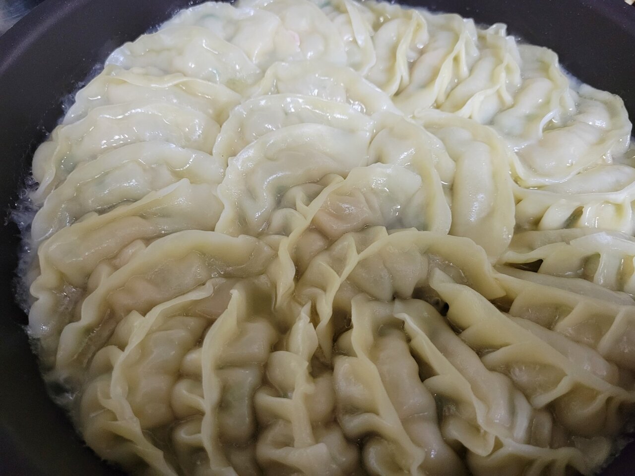 うまい!パンチが効いてる。ニンニクの味わいだと思いますが。餡が美味しい。単に味が濃いのではなくて、美味しさとしてのパンチがガツンと効いていて凄く気に入りました。あと、皮もしっかりしてるんですよね。大き目でつるんといただけて、ご飯にあう!とてもあう。ビール欲しい。ビール!