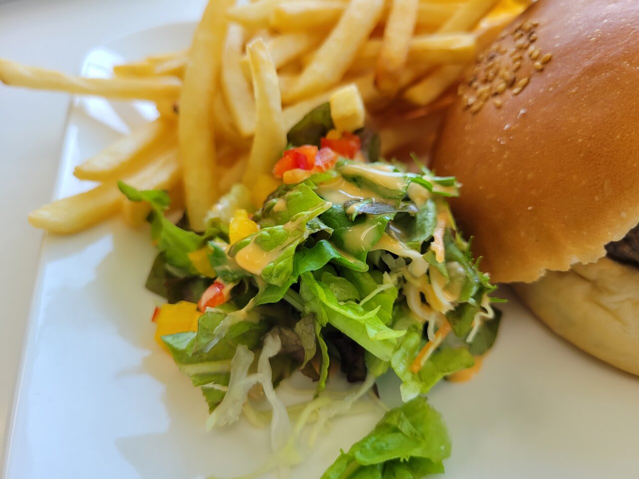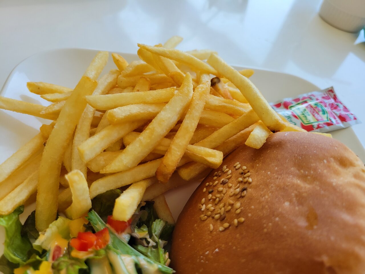 チリソースがトマトの上にのっかっていますね!そしてポテトフライは絶好調のボリュームです。