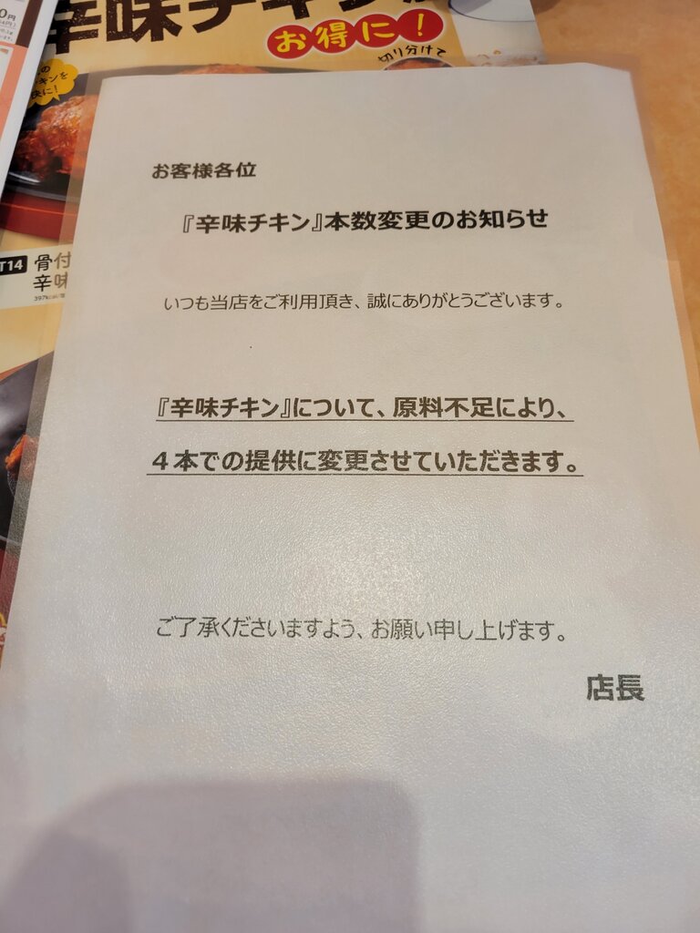 しかも、原料不足のはずなのにテイクアウトの冷凍辛味チキンは販売継続しているし…