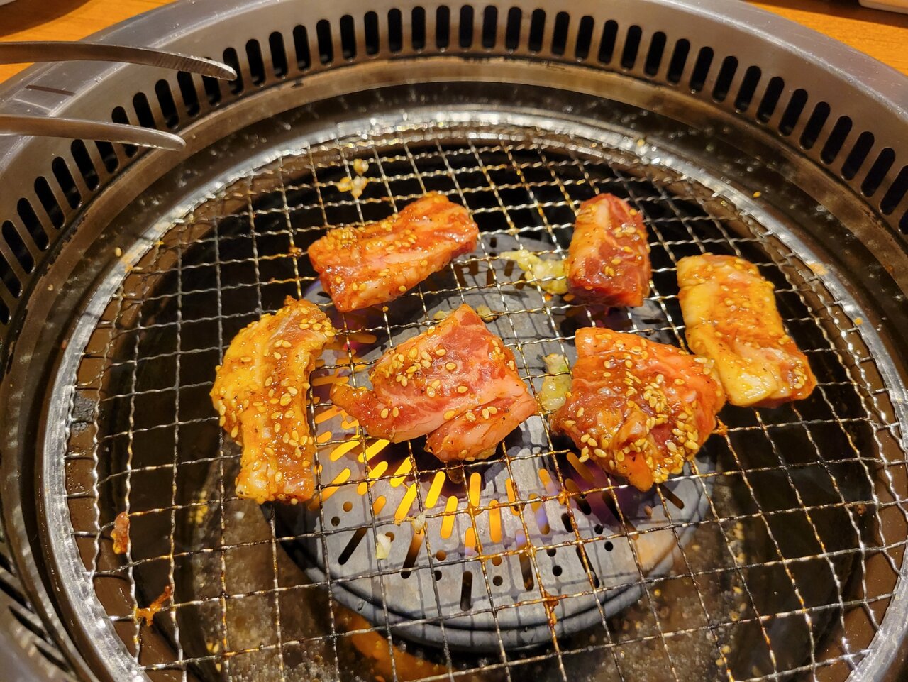 怒涛の如く到着したメニューをひたすら焼いて食べていきます。80分しかないので戦争ですね。