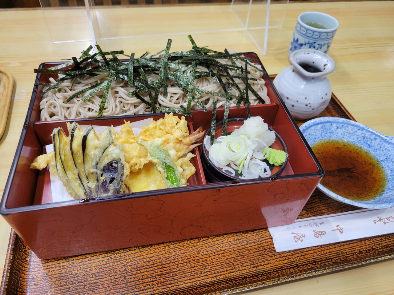 これが老舗のスペシャル感とでもいいますか、蕎麦・天ぷら・そばつゆがセットでのった器で運ばれてまいりました。こちら出前をやるときでも便利そうなきがしますね。右側に写っているのは天つゆであります。蕎麦湯も後ほどいただきました。