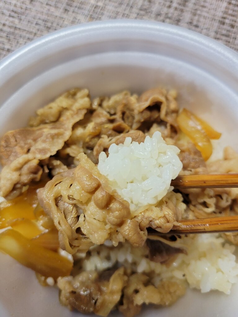 いわずとしれた松屋の牛丼ですので食レポせずとも味は皆さんご存じと思いますが、昔はつゆだくにして食べるのが好きだったのですが、最近は汁を全くなくして、その代わり生卵をかき混ぜてたべるのがお気に入りです。美味しいので是非試してみてください。