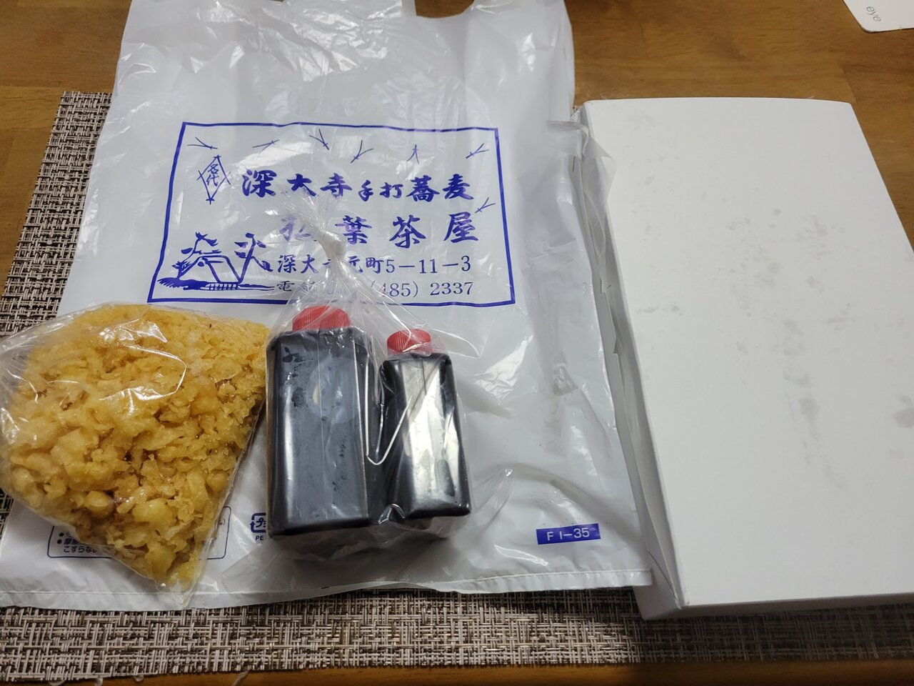 蕎麦に加えて、そばつゆと天かすもついてました。ありがたや。ありがたや。