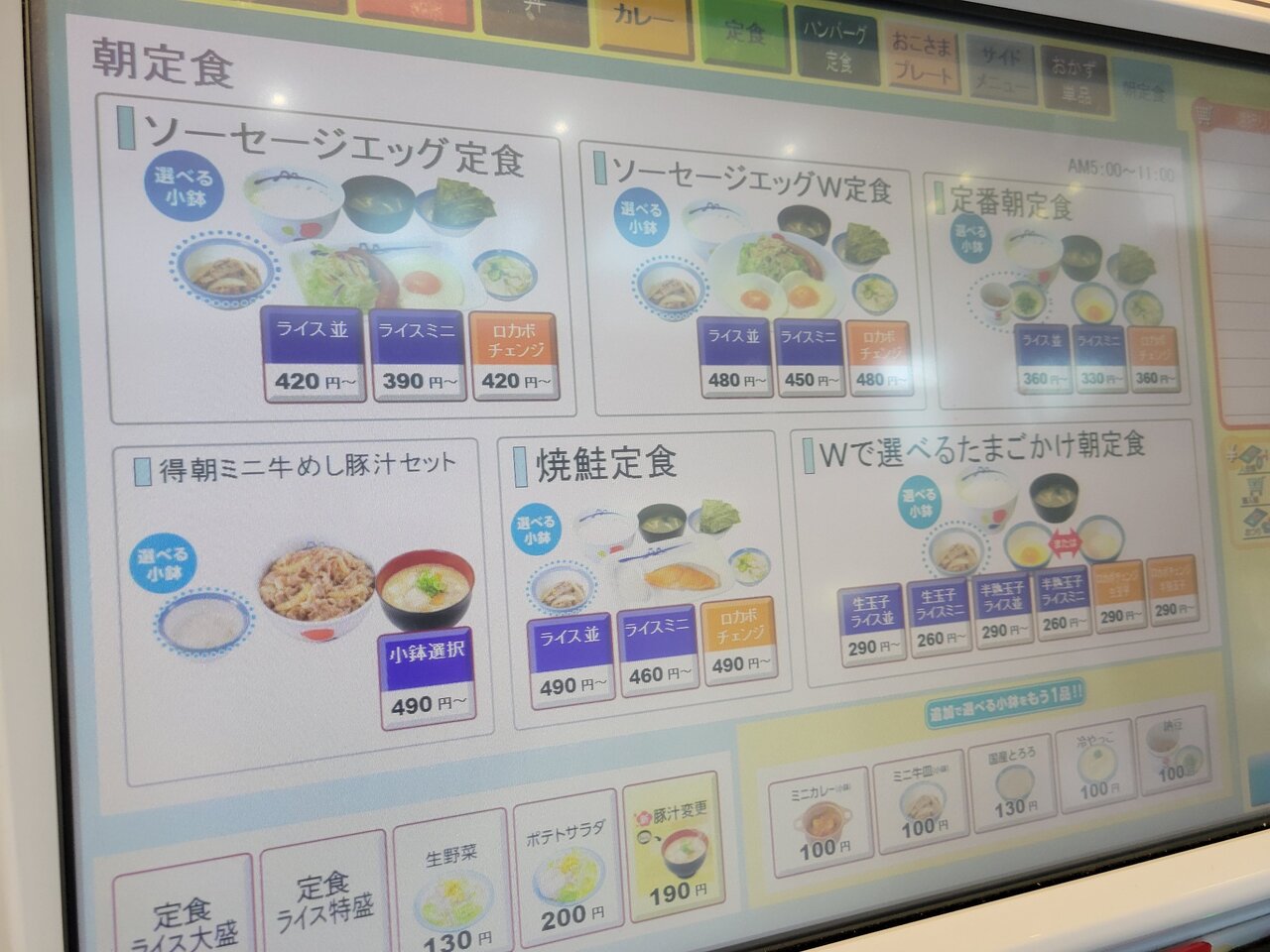 一番左上が鉄板メニューと思われますので、朝定食"ソーセージエッグ定食"をライスミニで注文しました。390円ですね!