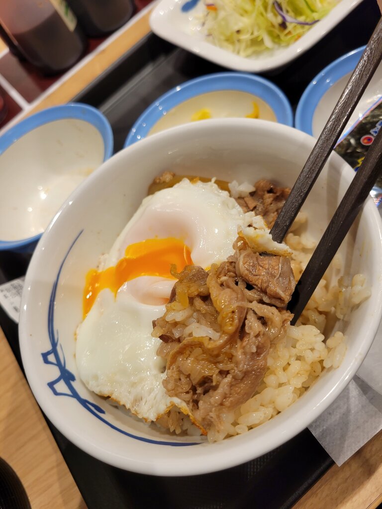 こいつ、パンにも牛丼にも目玉焼きをしょっちゅうのせるなと思われてしまったかもですが、のせちゃいました。黄身をトロンとくっつけていただきます。