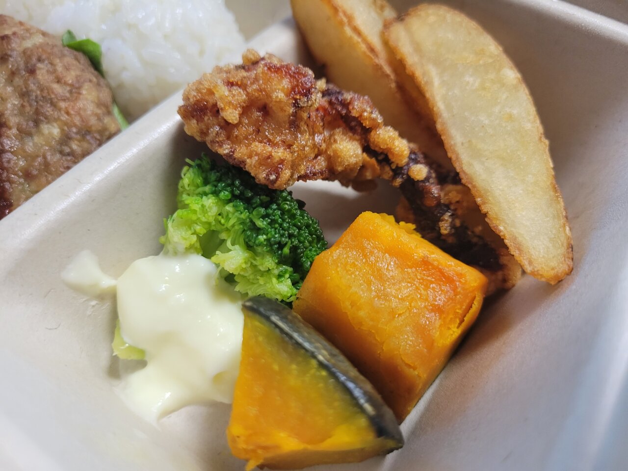 娘が喜びそうなハンバーグ・から揚げ・ポテト、ふりかけにゼリーまでついてましたね。これがすべてで270円と思うとかなり熱い!