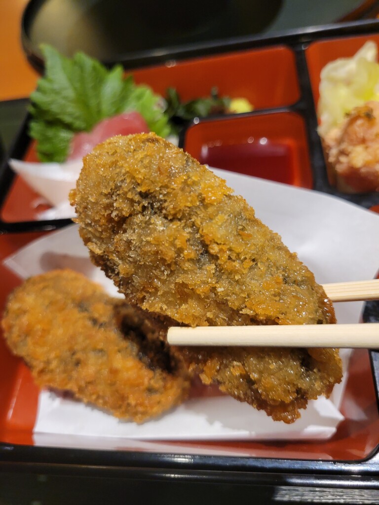 当日のおかずで気になったのは”海苔コロッケ”でしょうか。コロッケの具にノリが入っているという変わったコロッケがでてきました。