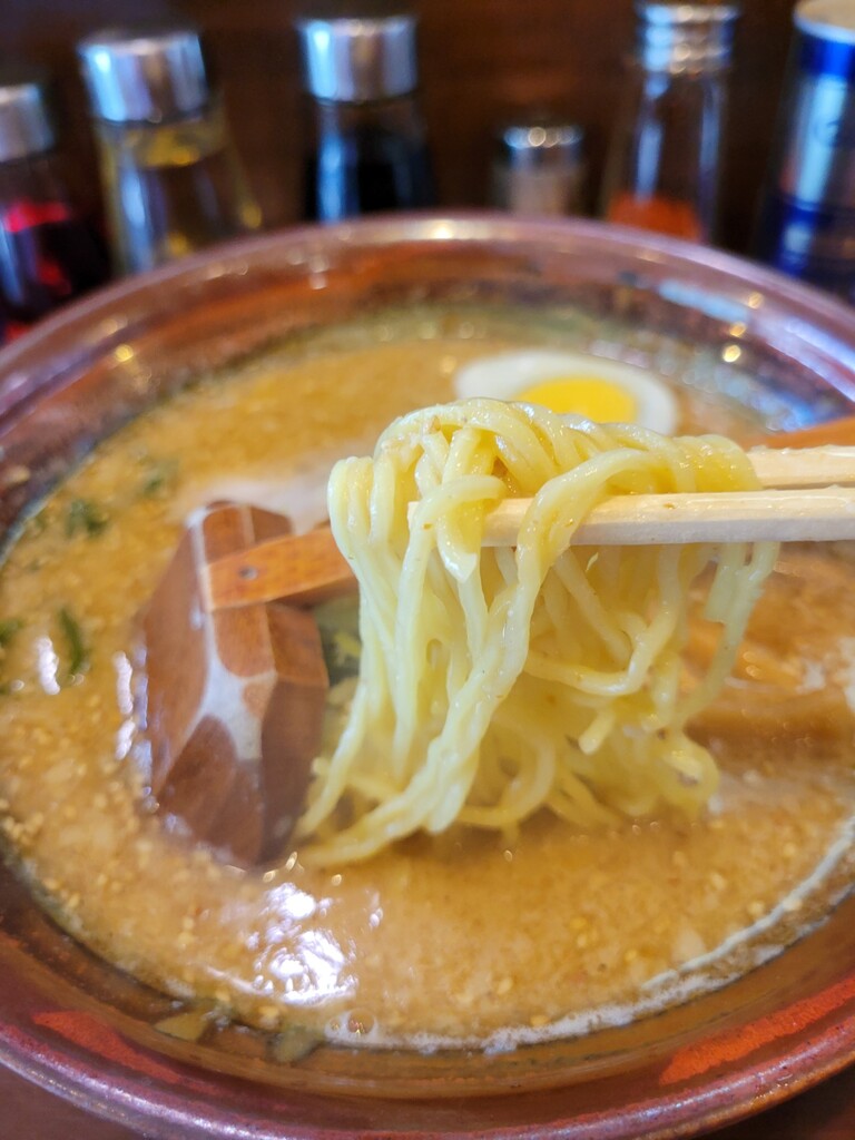 あっ!味噌パンチ系だ!スリごまの美味しさと、しっかり主張するこってり味噌スープの美味しさが麺に絡みついてとても美味しい。