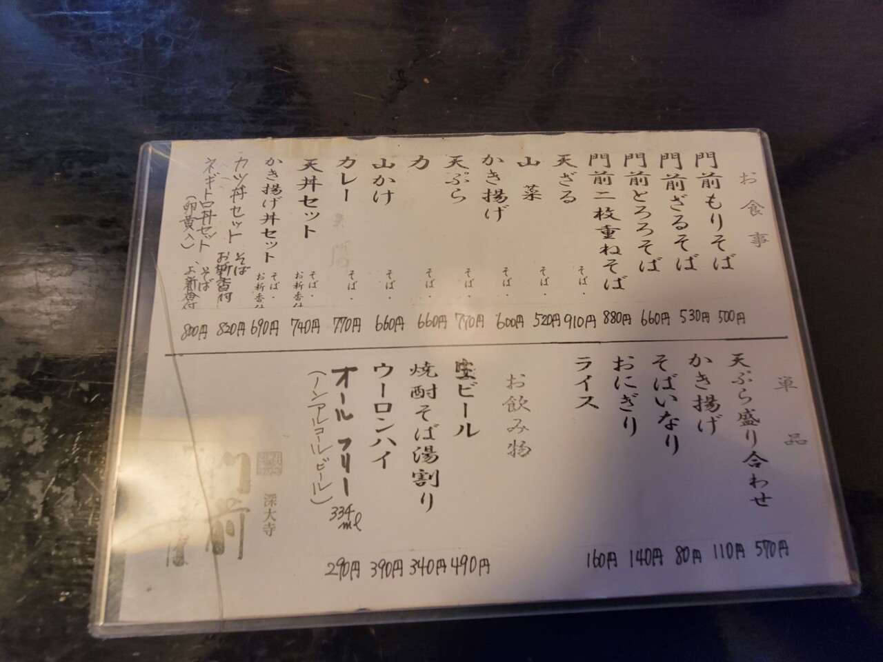 まずこちらがメニューなんですけども、門前もりそばは500円からとなっております。お寺の蕎麦といえば高いイメージではありますが、予想より安いです。