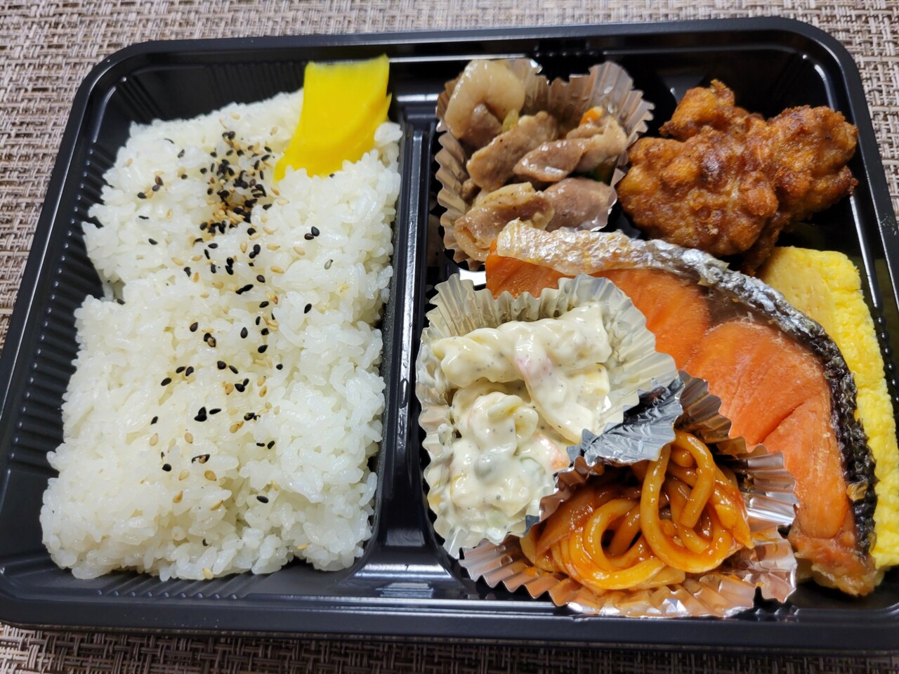 うん。さけとタマゴ以外は全部同じですね。基本味付けはどの具材もしっかりつけてありまして、唐揚げも甘いので子供は笑顔で食べておりましたね。美味しかったとのことです。