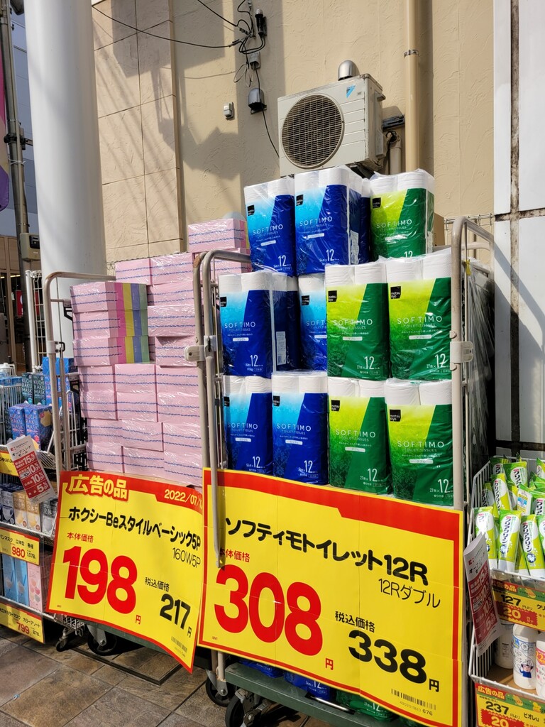 このティッシュ&トイレットペーパーは文句なしに安いですねえ。消耗品なので買いだめしときたいところですが、当日は家族移動で電車だったので涙を流して諦めました。