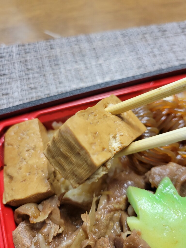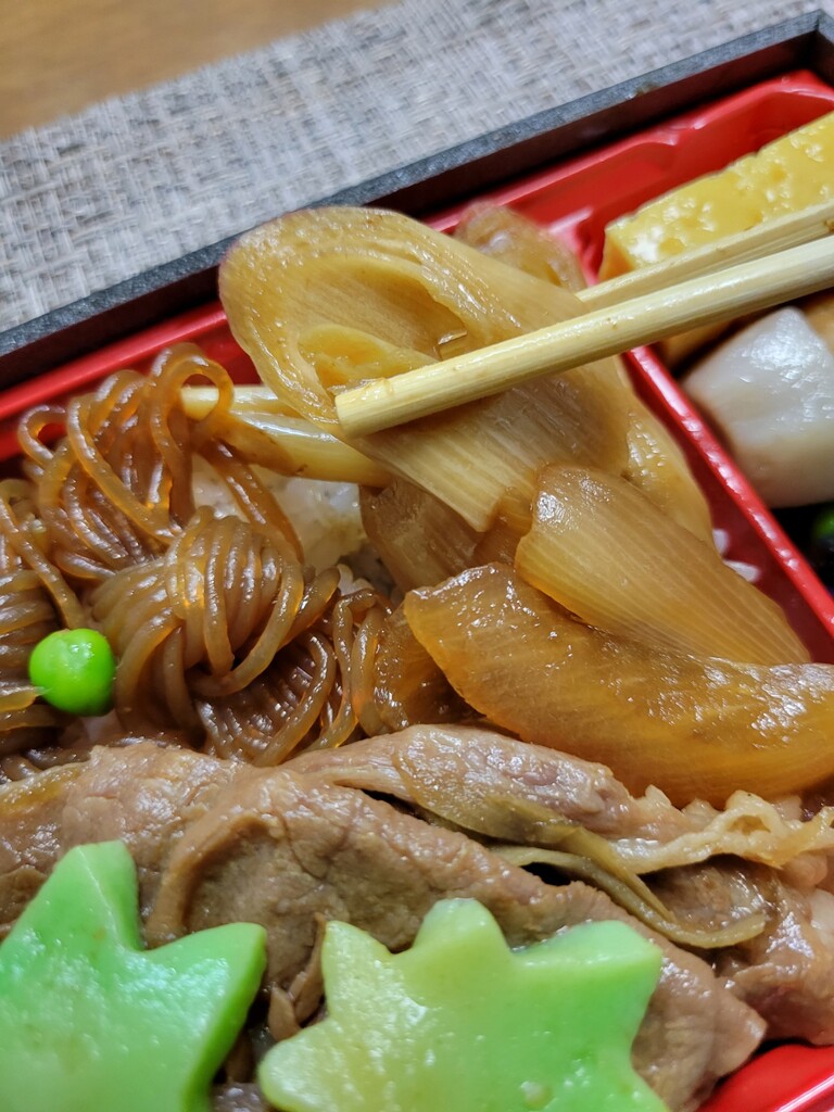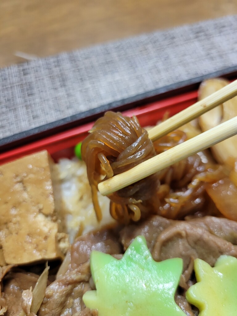 因みにこの弁当は肉の下も凄いんです。ここがポイントですね。ずっしりしたお肉を箸で上げますと、埋蔵されたすき焼きオールスターがでてきます。