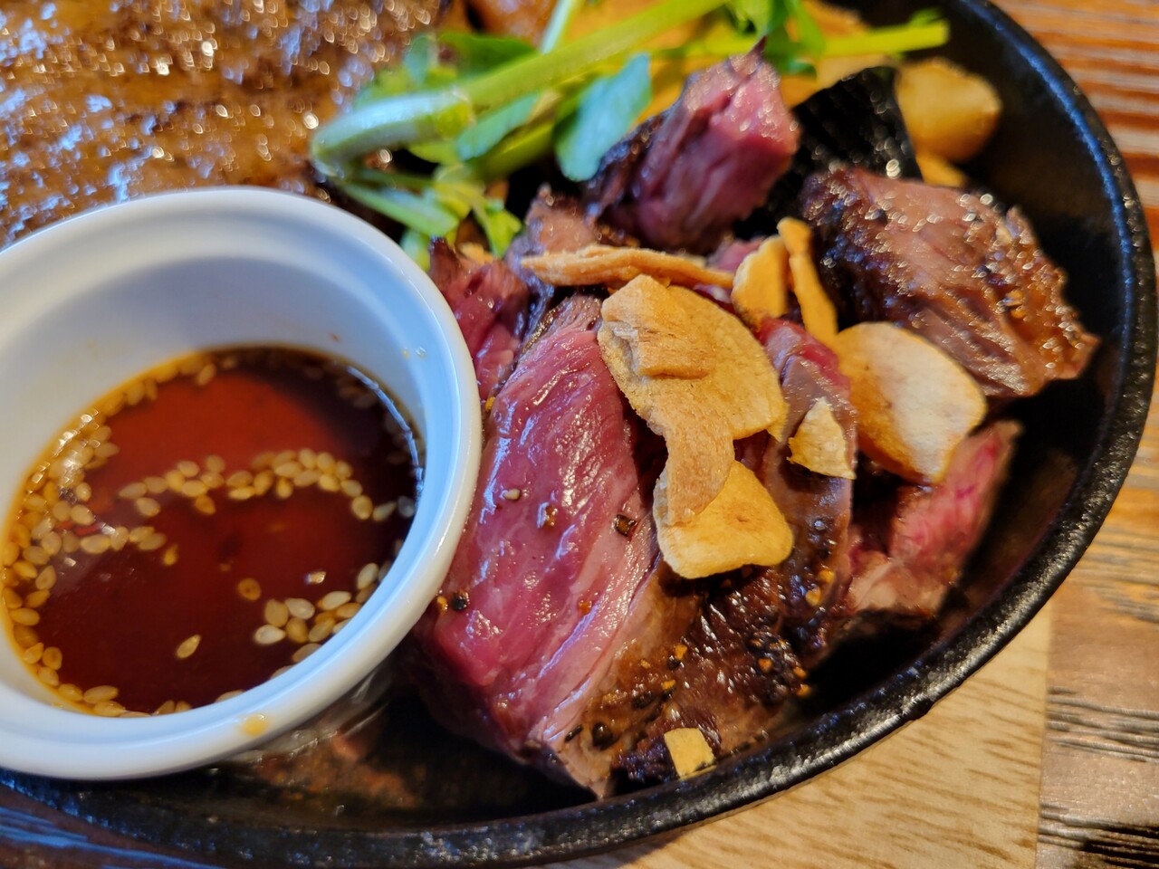 うん!美味い。焼き加減はレアとミディアムレアの中間ぐらいでしょうか。赤身肉なんですけども私の好きな焼き加減でとてもGOOD。肉を食べてるぜって実感する食べ応えのお肉に、ステーキソースをつけていただきます。