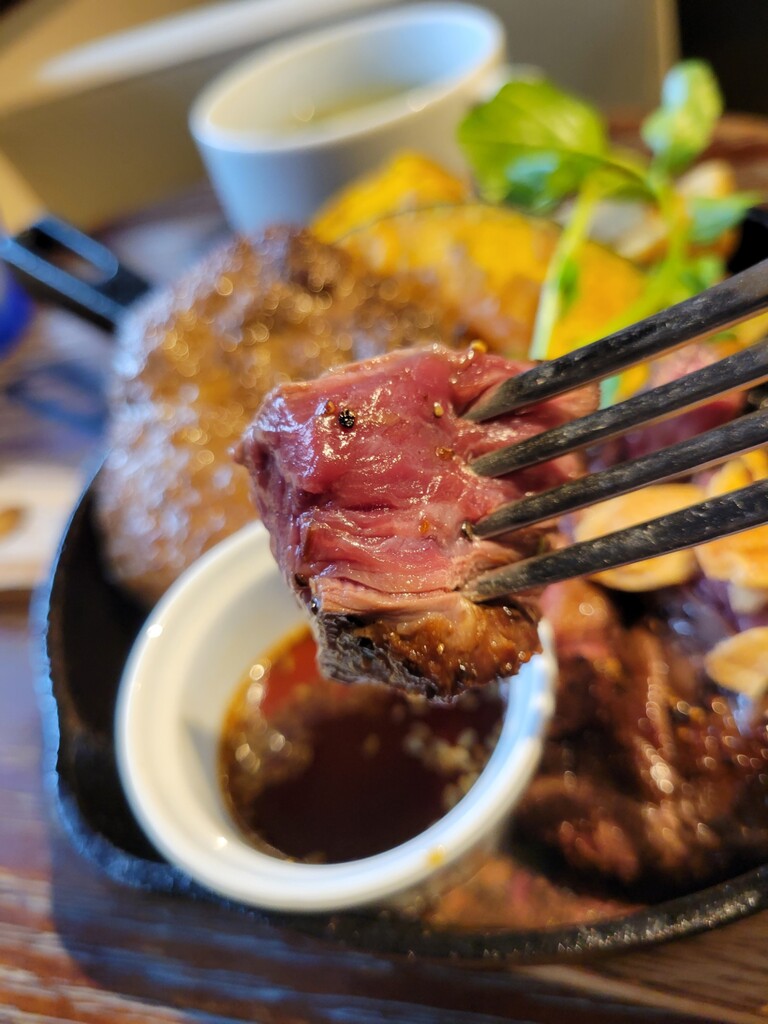 うん!美味しそう!熱々の鉄板にのって登場。熱いうちにさっそくいただきます。まずはステーキから。