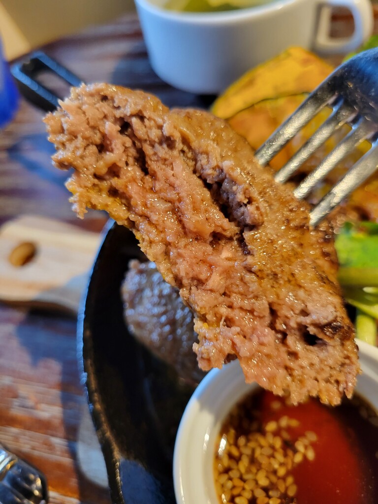 じゅんわわわーーーー ハンバーグにナイフをいれるとアブラが噴き出てきましたね。見た目だけでもまずはジューシー。そしてこちらを口にいれてもジューシー。
