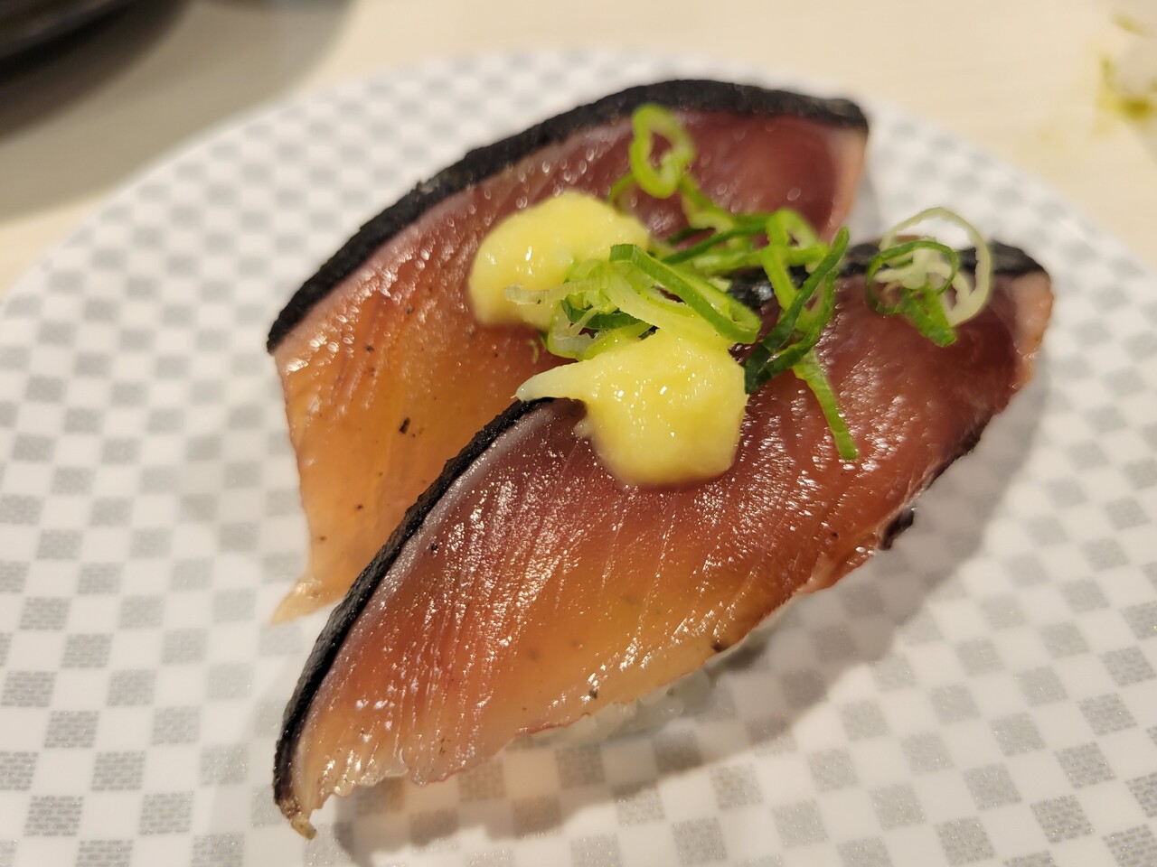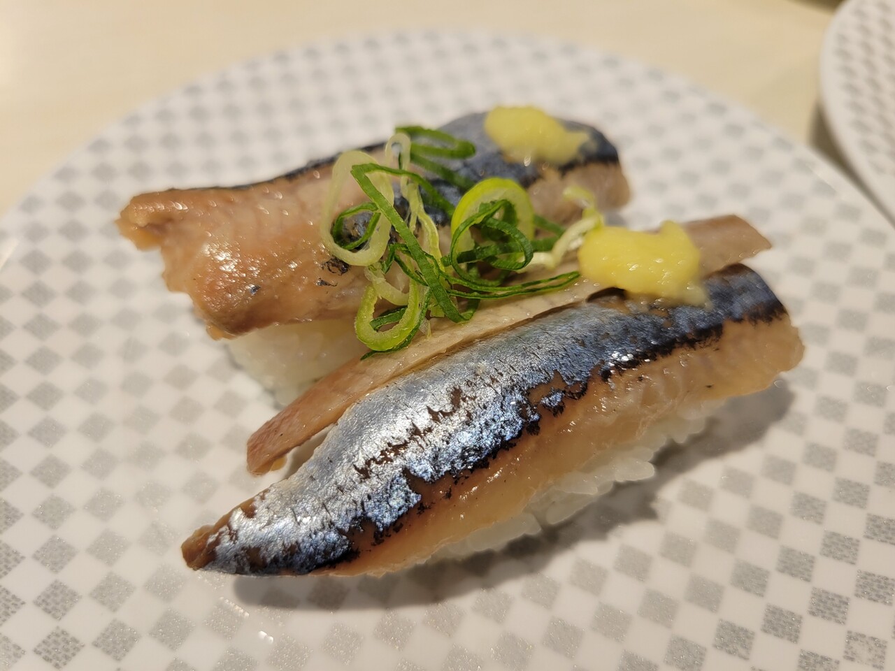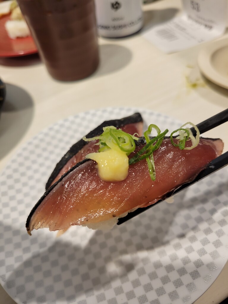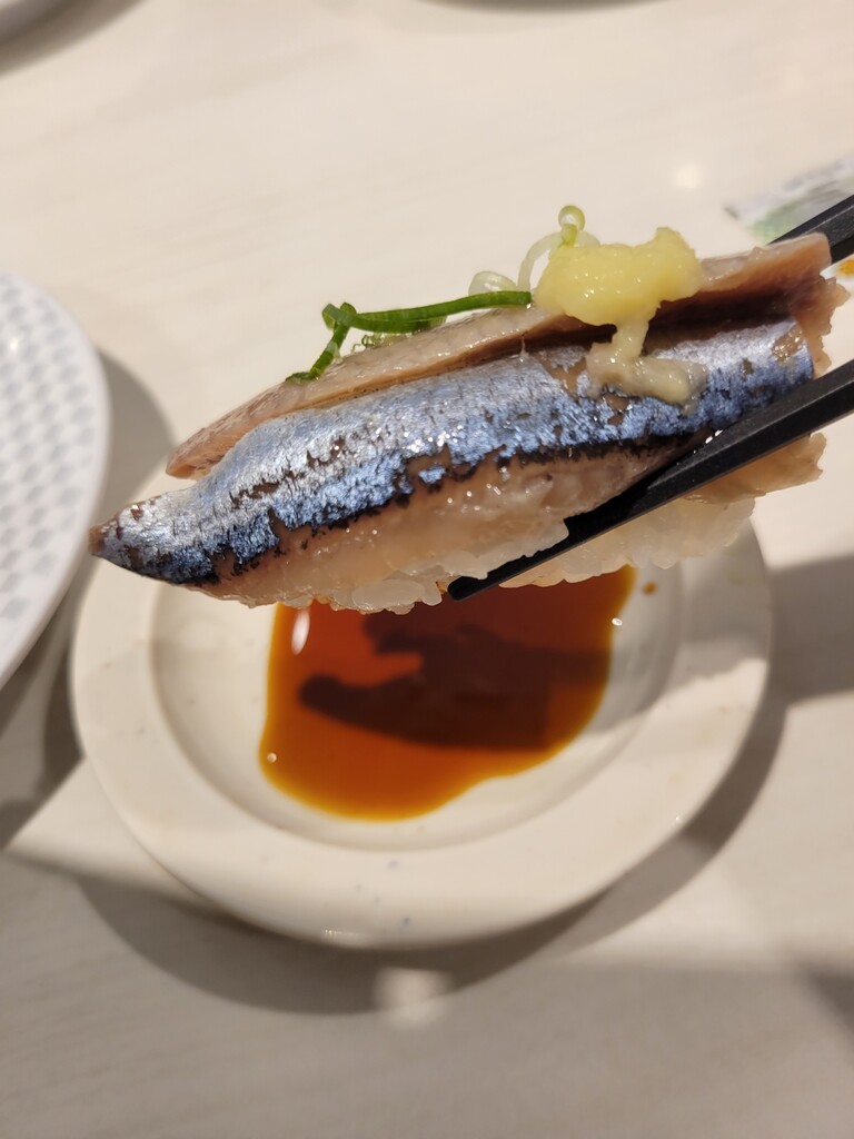 レーン寿司の楽しみといえば、大好物を人目を気にせずに食べれることでしょうか。ということでさんまのにぎりをいただきます。