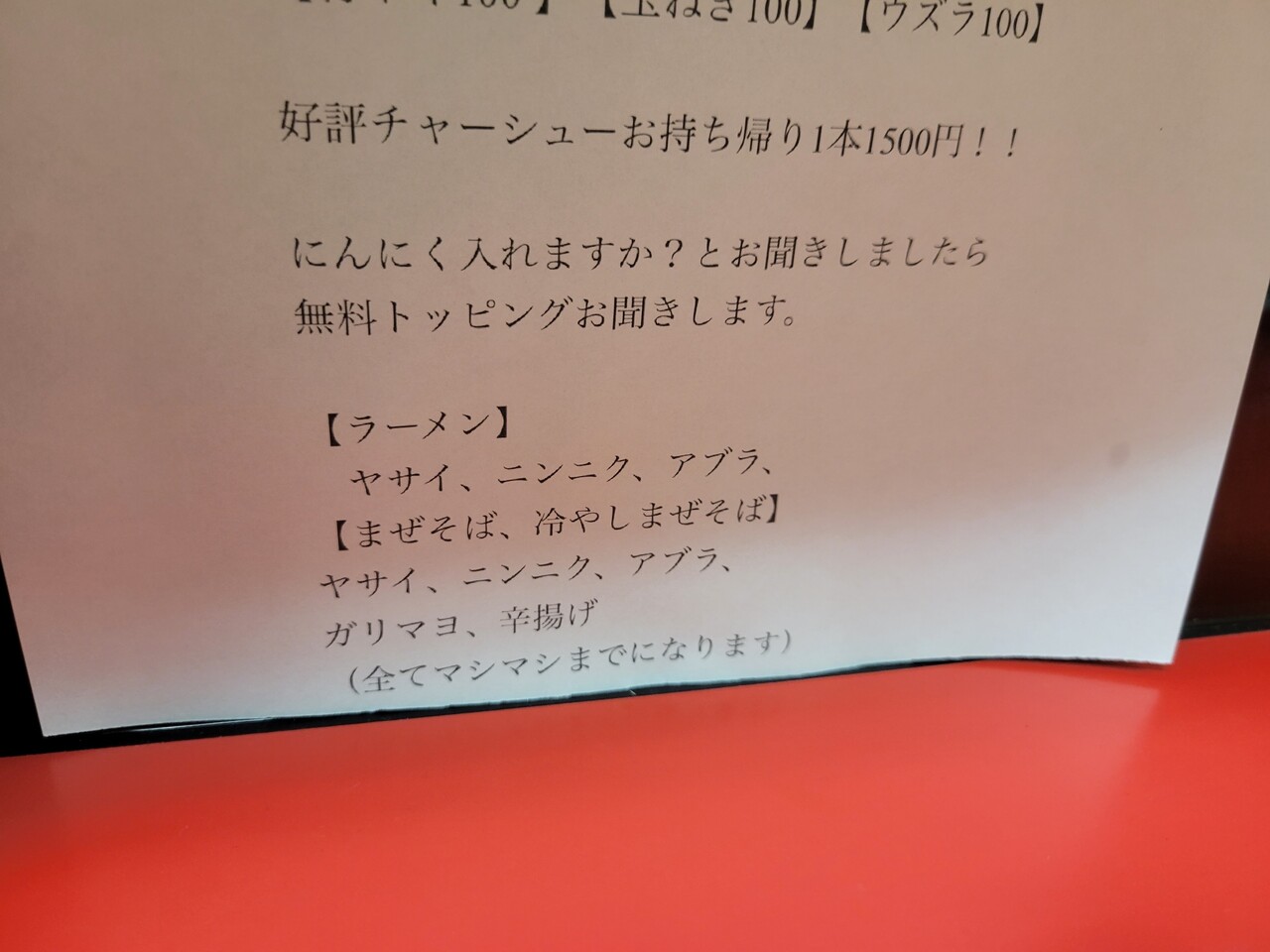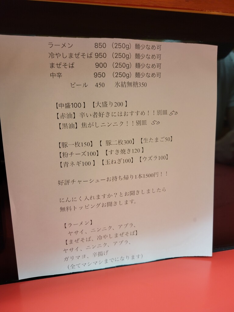 ここでトッピングをオーダーできます。ラーメンとまぜそばでトッピングの種類が違います。わたしはトッピング全てとお願いしたので「ラーメン・豚一枚・ヤサイ・ニンニク・アブラ」となりました。どんなラーメンになるのか楽しみであります。因みにもうアラフォーなのでマシマシは回避しました(笑)