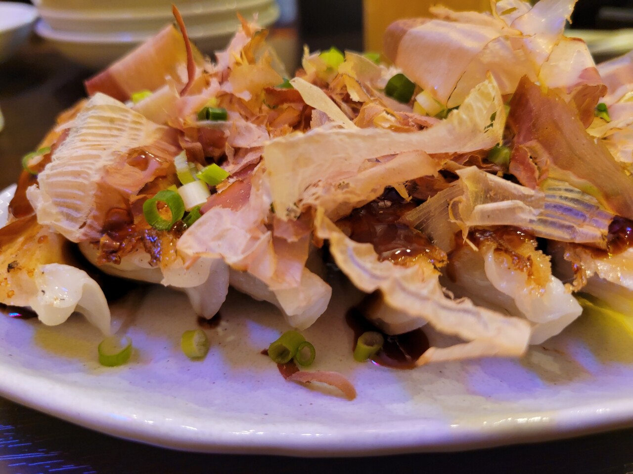 あと、子供たちが喜んだのはこちらの「お好み焼き風餃子」。餃子の上にたっぷりのかつお節と甘めのタレをかけたメニューなんですが、意外なことに餃子とお好み焼きの味付けって合うもんですねえ。