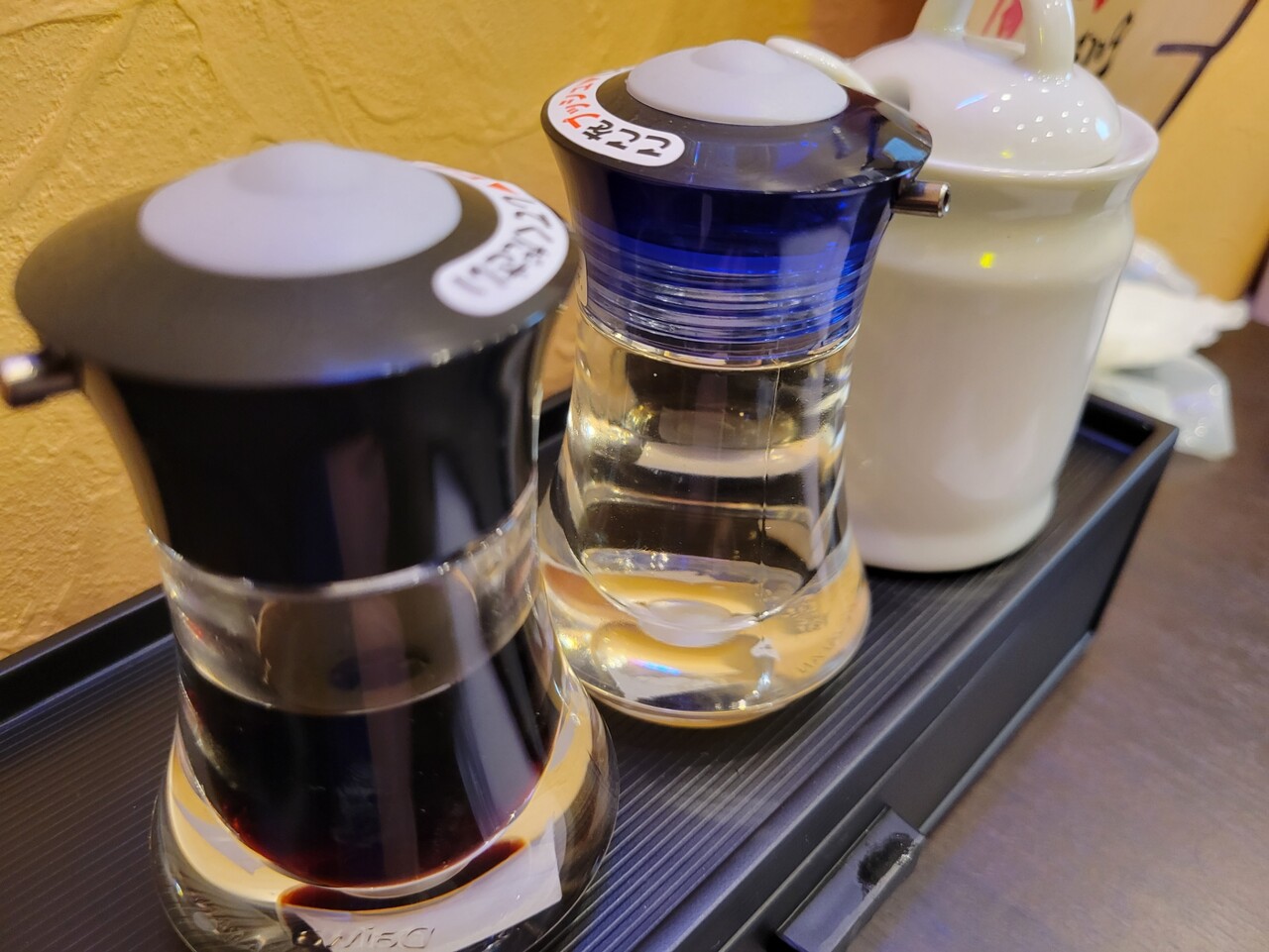 こちらの餃子を備え付けのこだわりラー油と酢と醤油でいただきます。