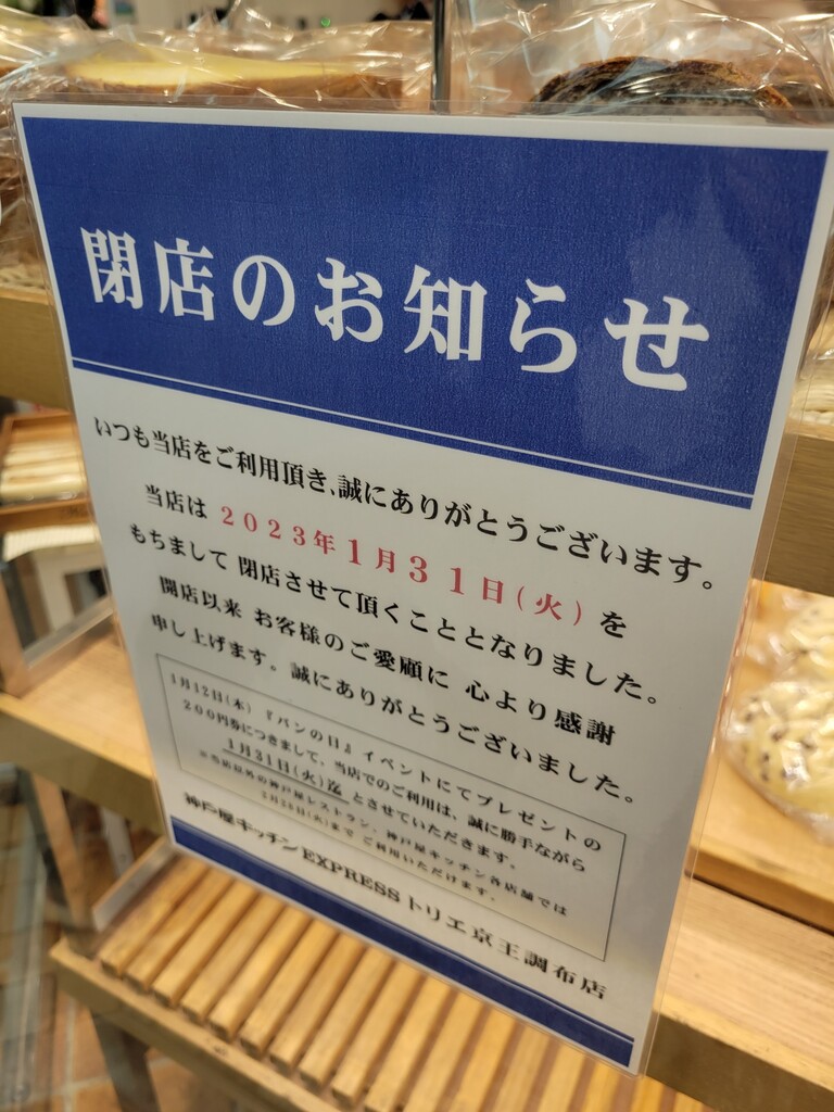 神戸屋キッチンEXPRESSトリエ京王調布店が1月31日で閉店