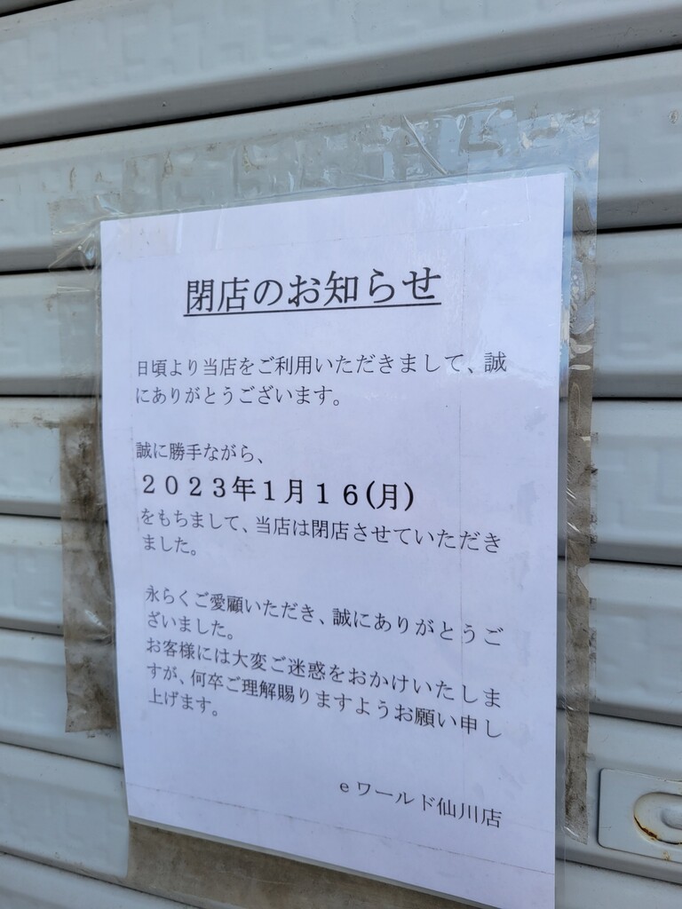 先日仙川の街を歩いていましたところ、残念なことに閉店のお知らせを見つけてしまいました。駅前広場にあるインターネットカフェ"eワールド仙川店"さんが1月16日に閉店してしまったようです。