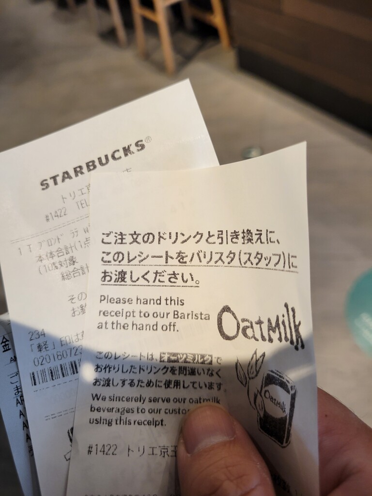 自然と意識高い系の飲み物を頼んでしまったようですが、ものは体験であります。ちなみにオーツミルクの商品の場合は引換券で渡すんだそうですね。