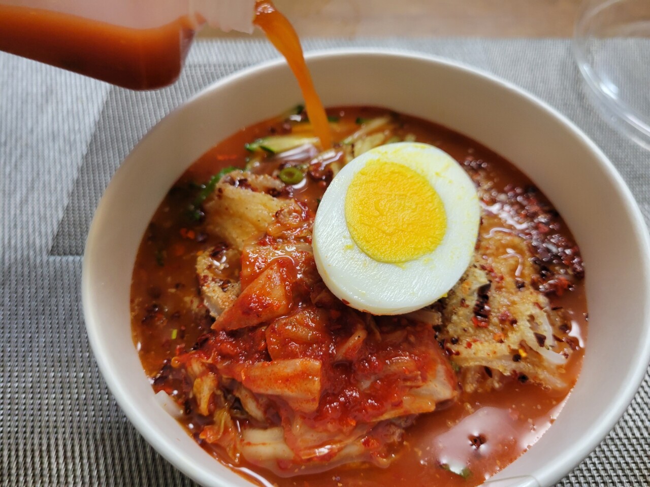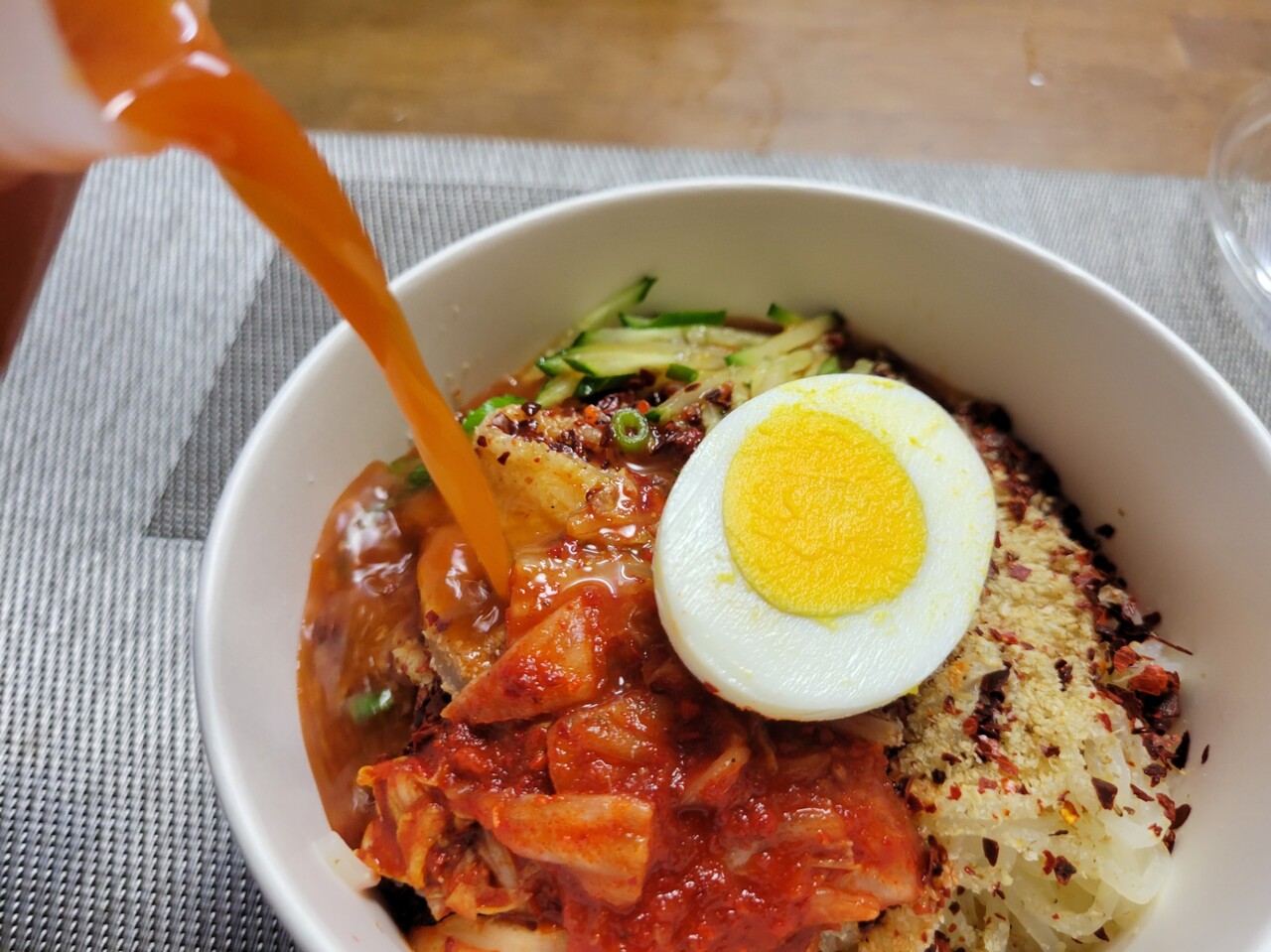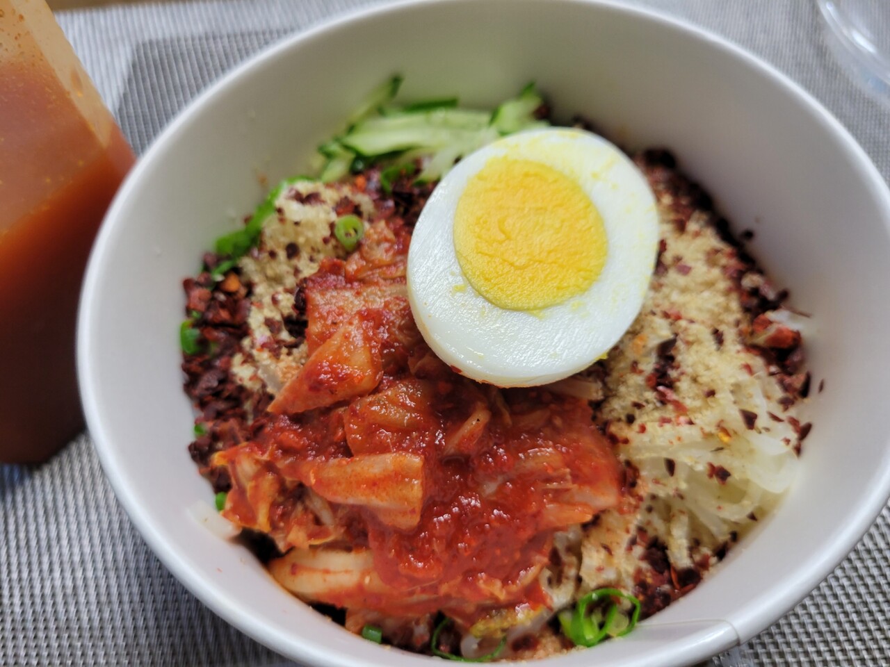基本的には出前を普通に頼むと高くつくので、家計の関係でセールの商品を頼んでしまう私なのですが、半額セールの盛岡式自家製辛冷麺(980円→490円)と彩ビビンバ並辛(1200円→960円)を注文しました。40分ほどで届きましたのがこちら。まずは辛冷麺から。