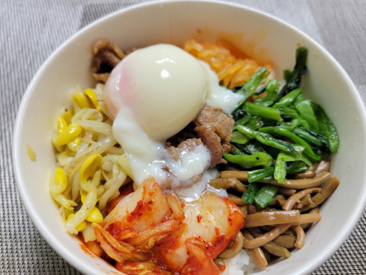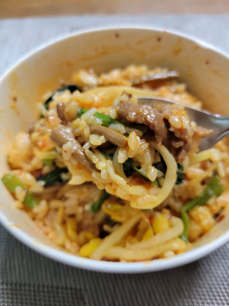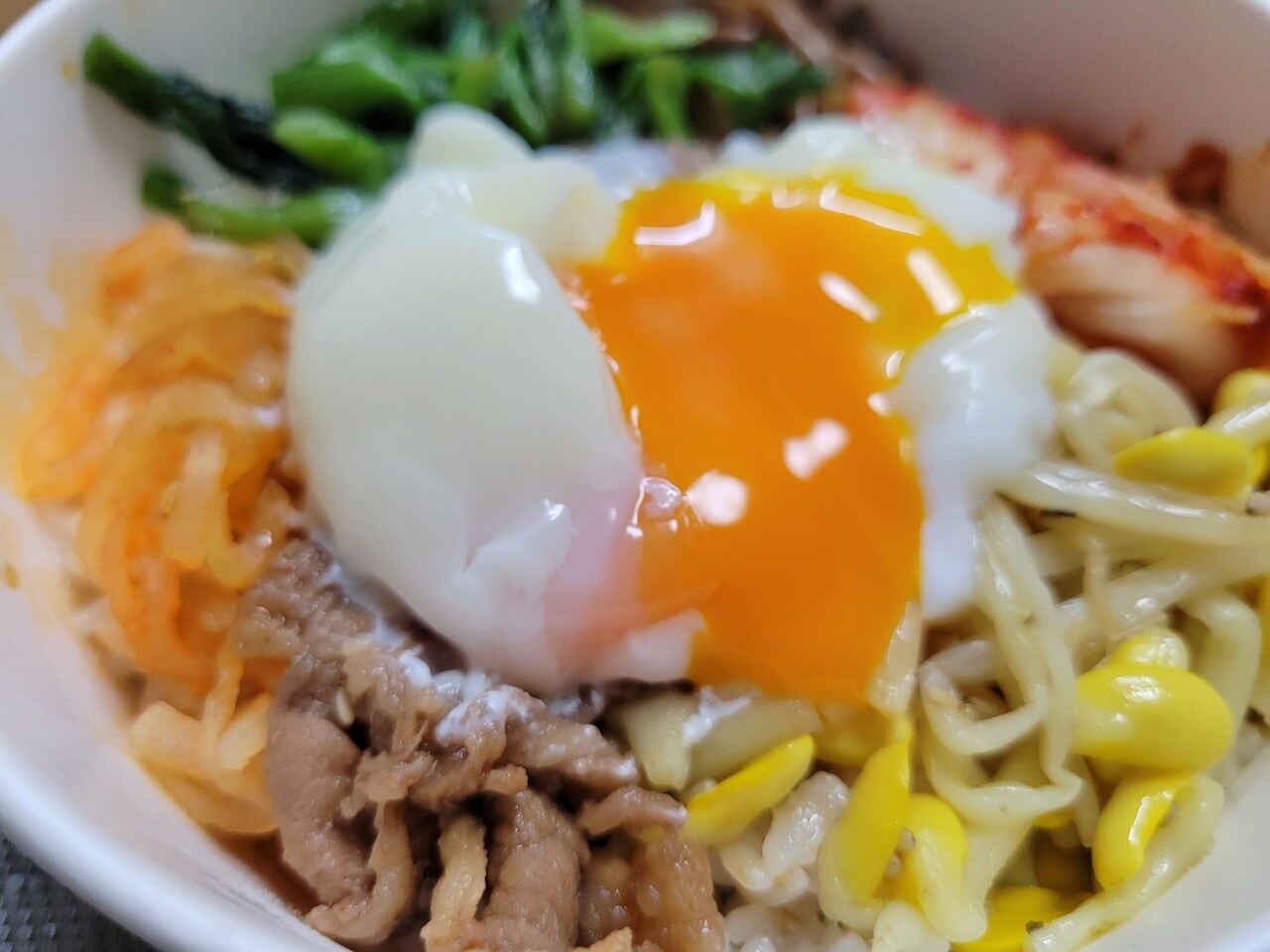ほーん!!これは予想より美味しいですね。しっかりと具材がはいっているので、口の中が寂しくならないです。半熟卵とビビンバがうまく絡みついて、濃厚で美味しいですね。