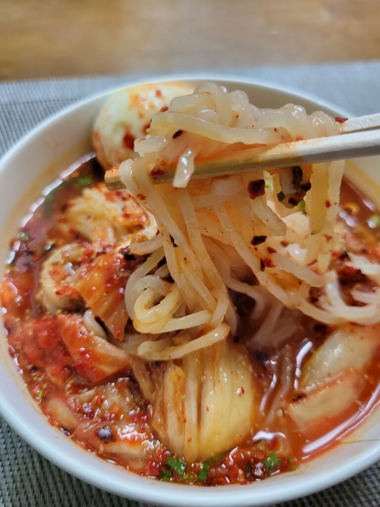 ほほー具材はシンプルですね。キムチにきゅうりに玉子にネギ、そして大量の唐辛子ってところでしょうか。こちらにスープを入れていただきます。