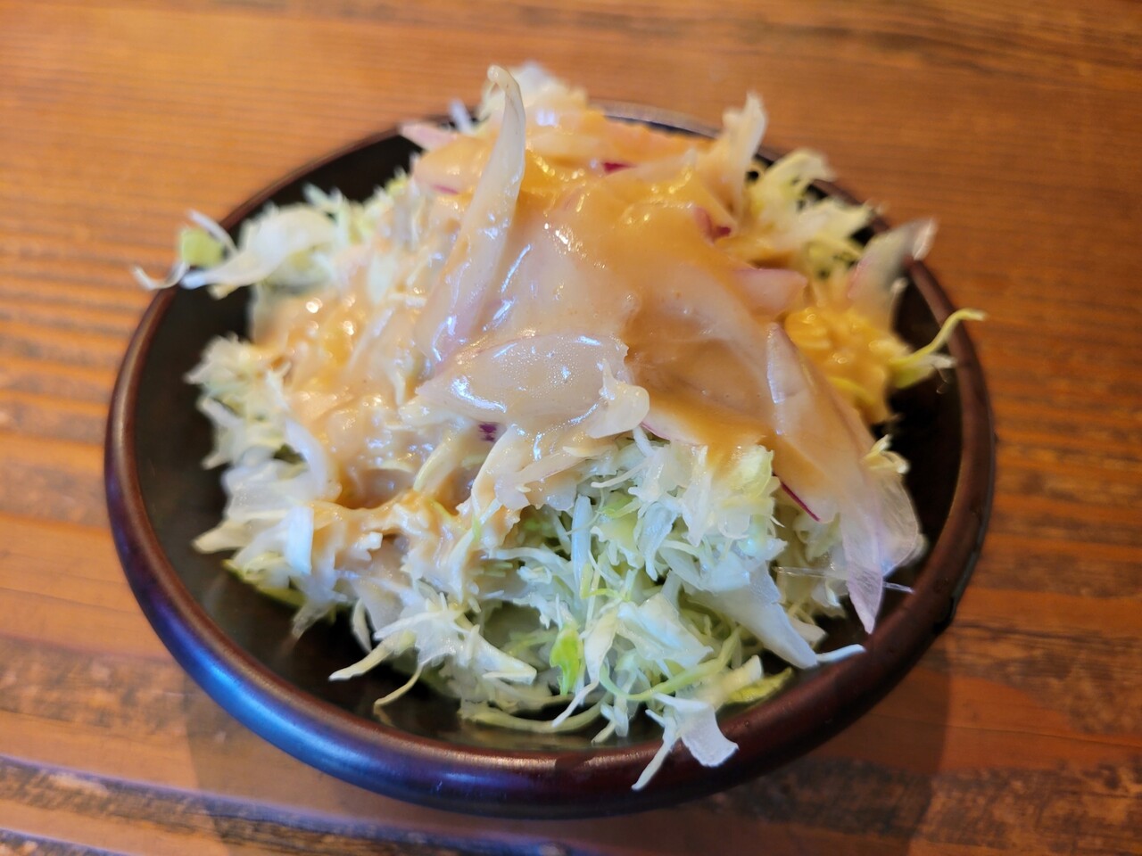 なんていうか、いたれりつくせりだったんですよね。因みに、ジャスミンさんが教えてくれたコーヒーもセットでついてきたんですよね。ランチタイムは「ライス・みそ汁・サラダ・コーヒー」が付くという最強のサービスなのであります。因みにランチタイムは11:30~14:00となります。まず出てきたサラダはこちらです。