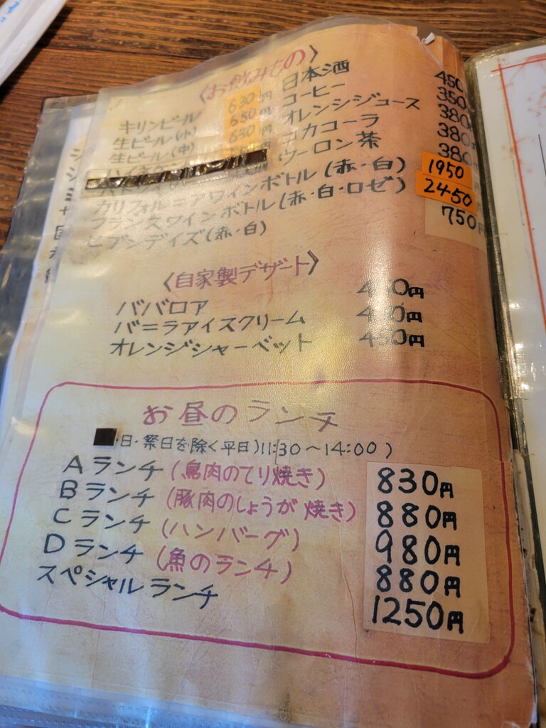 早速ですがメニューのご紹介であります。メニュー表が年季がはいっていてカッコいいです。ずっとこのままでいて欲しいですね。