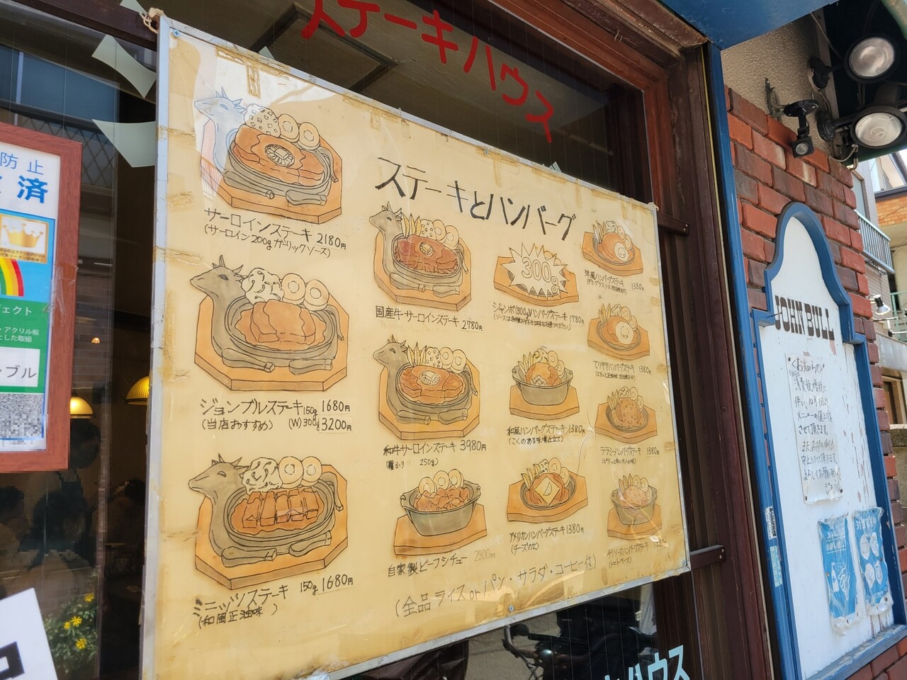 お店の外観からしてステーキハウス感があるので、近くを通っていただければわかると思います。因みにお店の窓に、このメニューイラスト飾ってありますので安心してください。