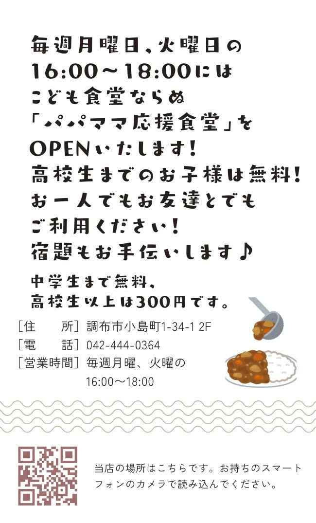 お話をうかがった限りだと、気軽に子供たちが学童のような感じでお店に来て欲しいとのことで、お店で宿題などもしながら御飯も出てくるという、結構かなり子供たちにとっては夢のある応援食堂だなと感じましたね。