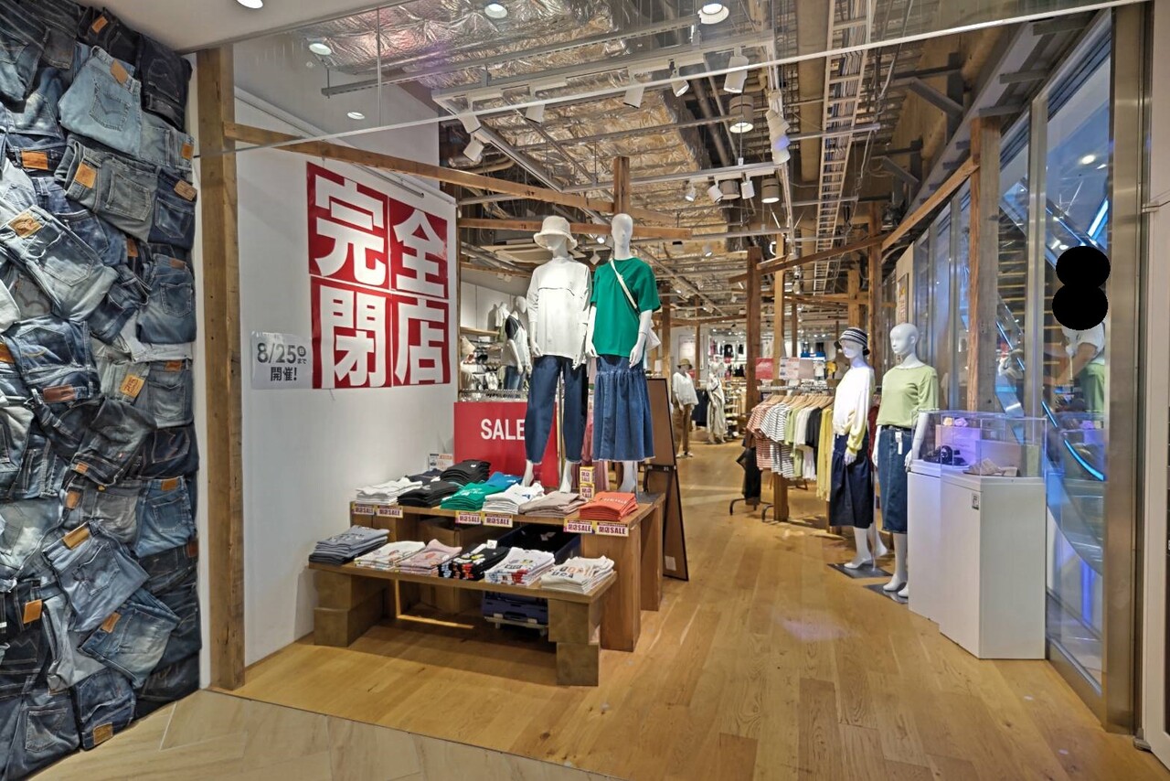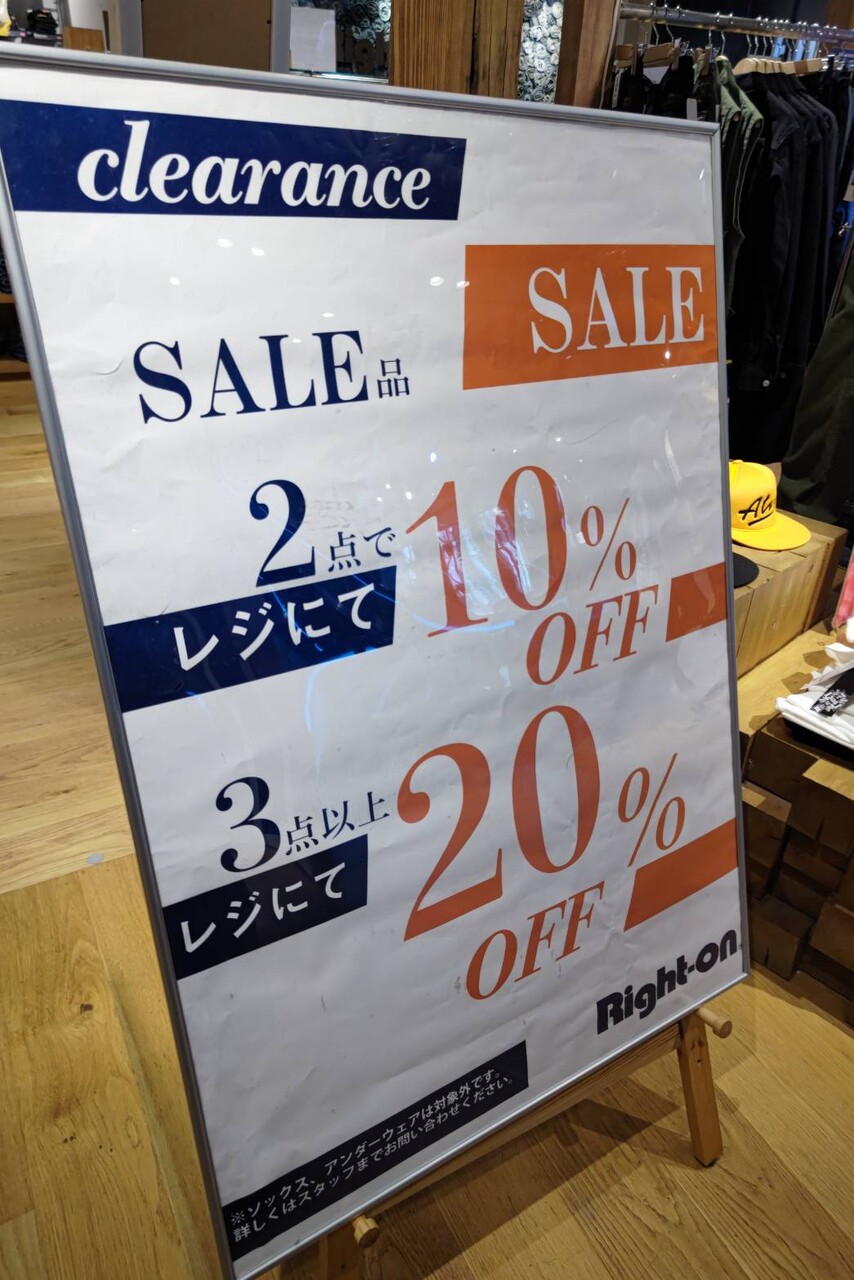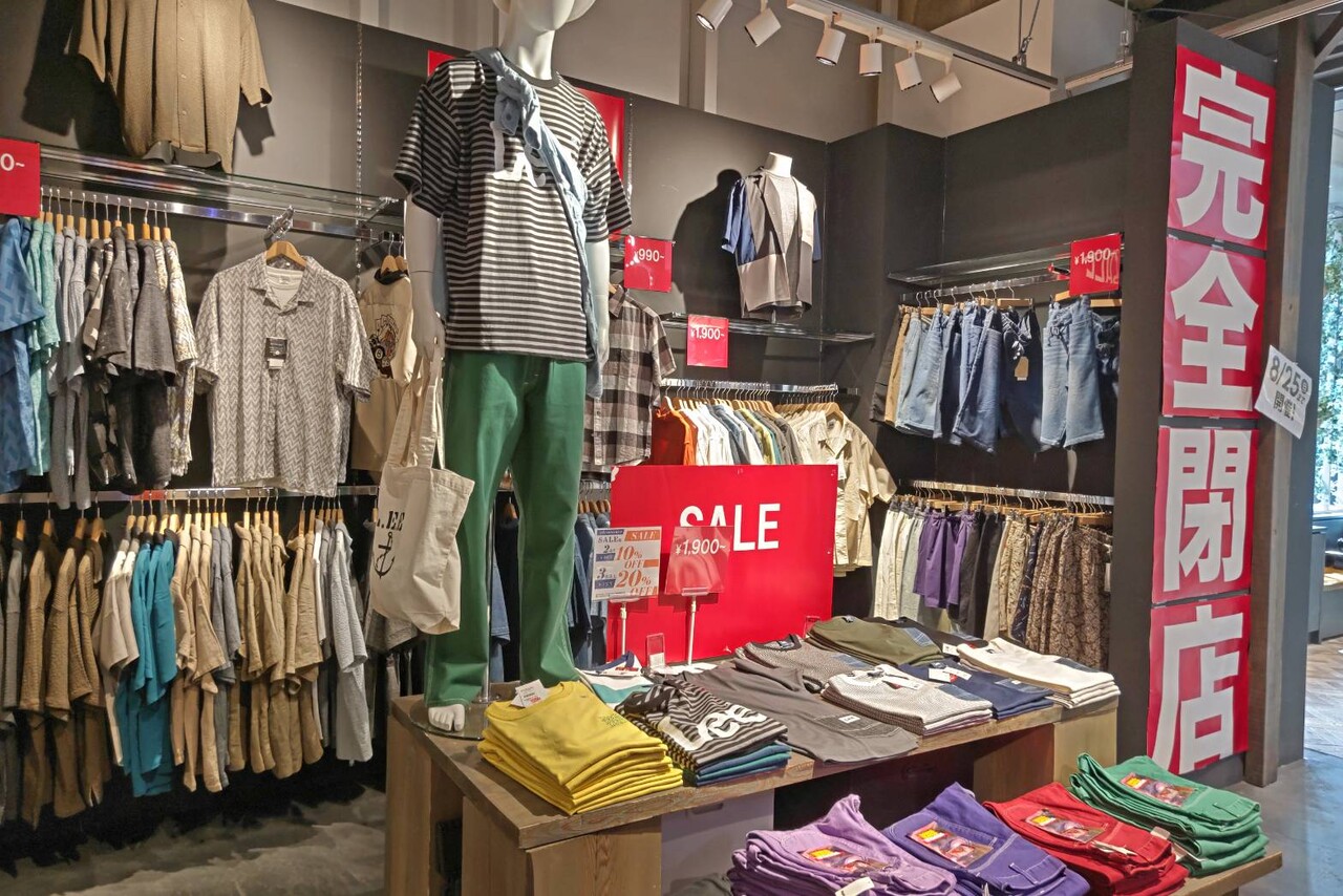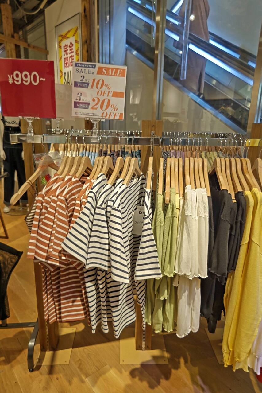完全閉店セール、8月25日まで開催との事です。個別の洋服の割引があるものにプラスして、3点買うと更に割引ということで、中々な割引率の商品もありました!