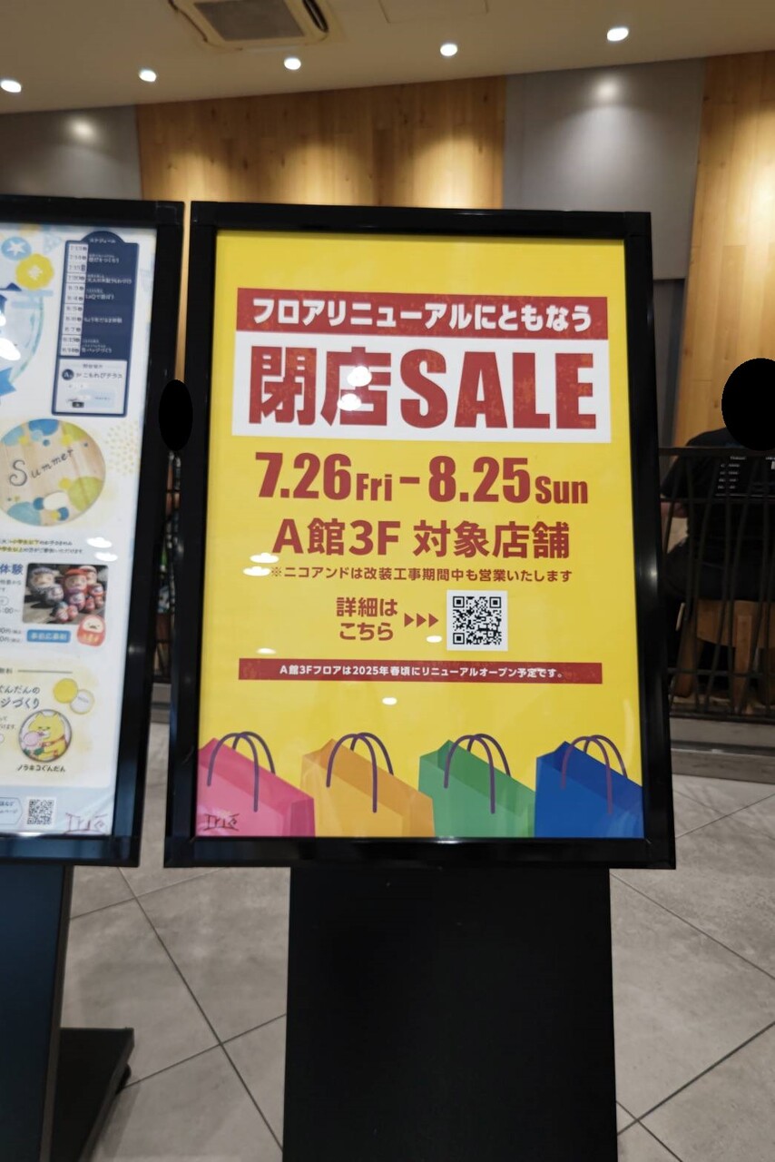 いただきました情報を元にトリエへ行ってみましたところ、トリエに入ったところでさっそくありましたフロアリニューアルに従う完全閉店セールのお知らせ。