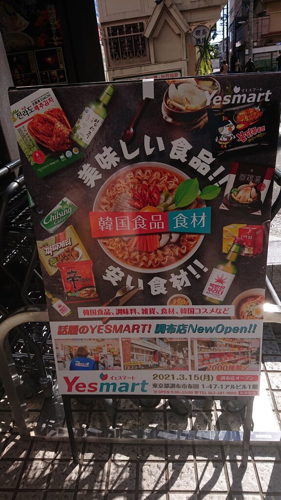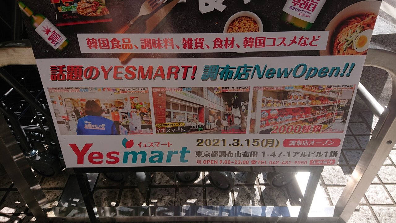 調布駅前すぐの場所に明日の3月15日に韓国食品、食材、雑貨、韓国コスメを取り扱うYesmart(イエスマート)がオープンします。