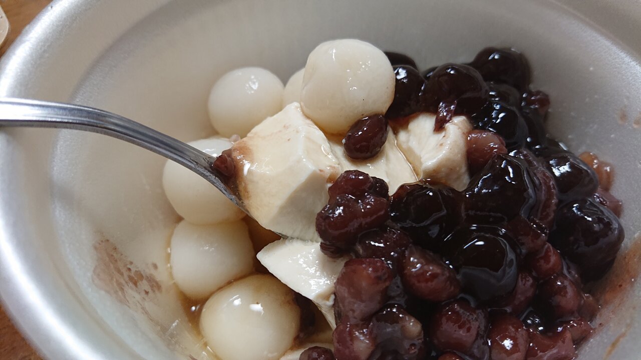 二段重ねになっているのですが、上が小豆や白玉にタピオカ、下に豆花。