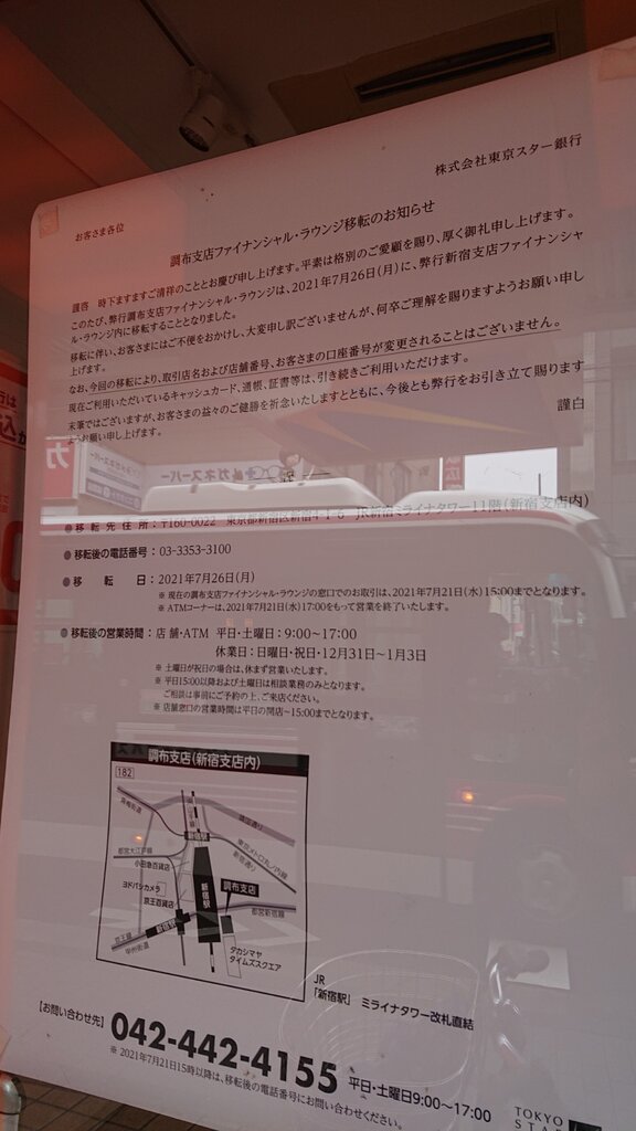 2021年05月17日 【移転予定】東京スター銀行 調布支店ファイナンシャル・ラウンジ 調布駅前にあります東京スター銀行なんですが、2021年7月26日に移転するんだそうです。なんでも調布市内の移転ではなく、新宿支店内への移転だそうでして、まあ銀行の支店が変わると色々と面倒だろうし、名前は残す系の大人の話なんだと思いました。銀行って大変ですねえ。顧客の方はすでにご存じなんだろうと思いますが、コロナで出歩かず気が付かないとかあると困るかと思ったので、念のためご紹介いたしました。東京スター銀行ファイナンシャル・ラウンジ〒182-0024 東京都調布市布田1-37-12 < 前の記事次の記事 > コメント コメントフォーム 名前 コメント 記事の評価 リセット リセット 顔 星 情報を記憶 コメントを投稿する